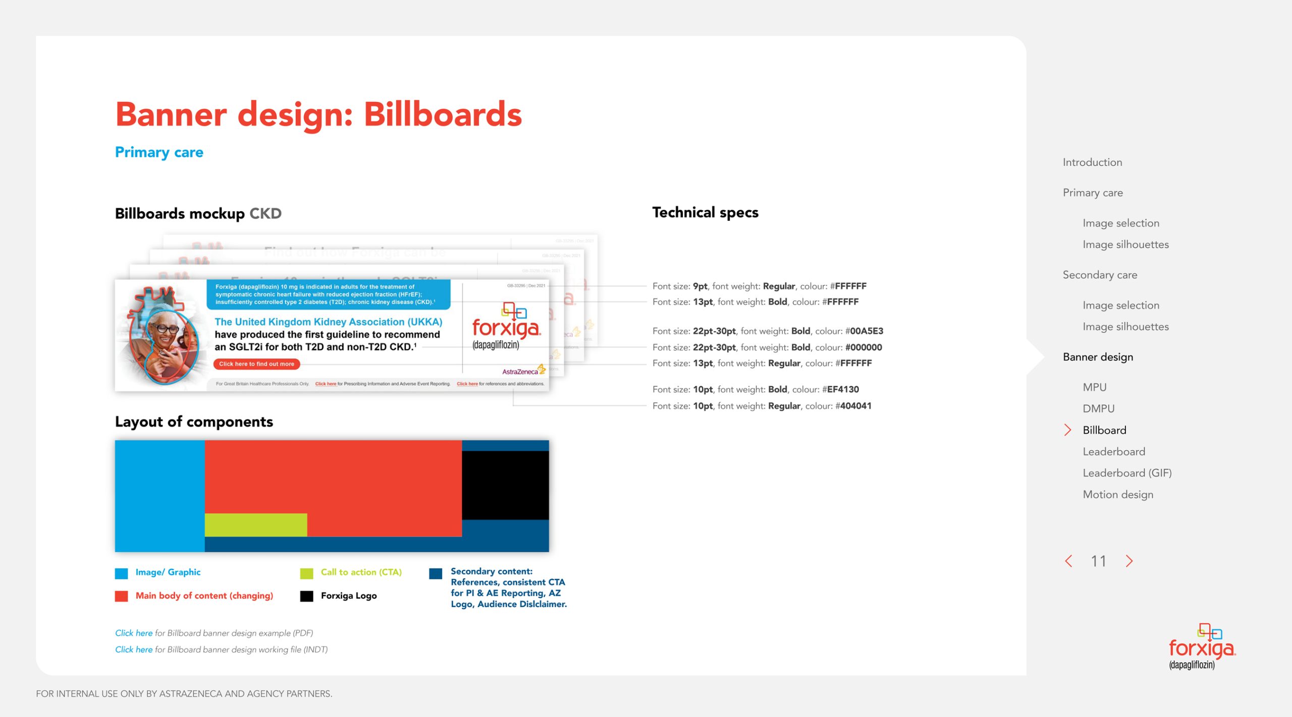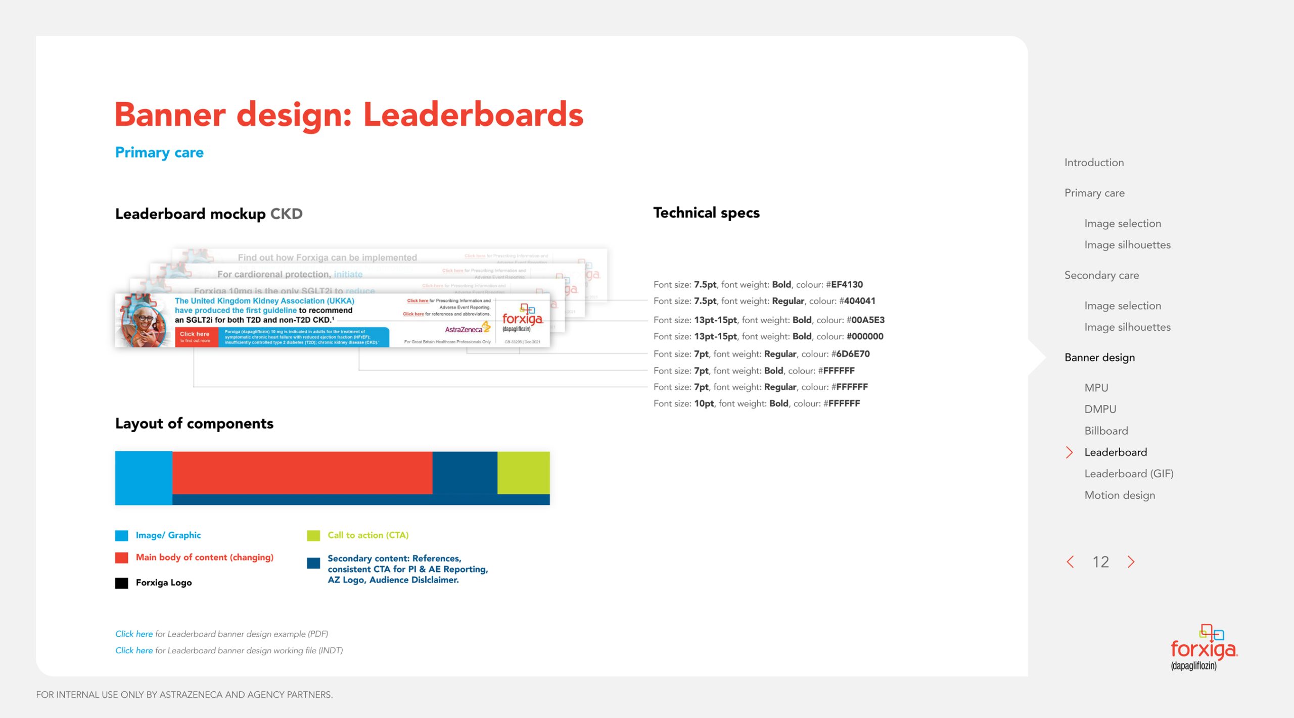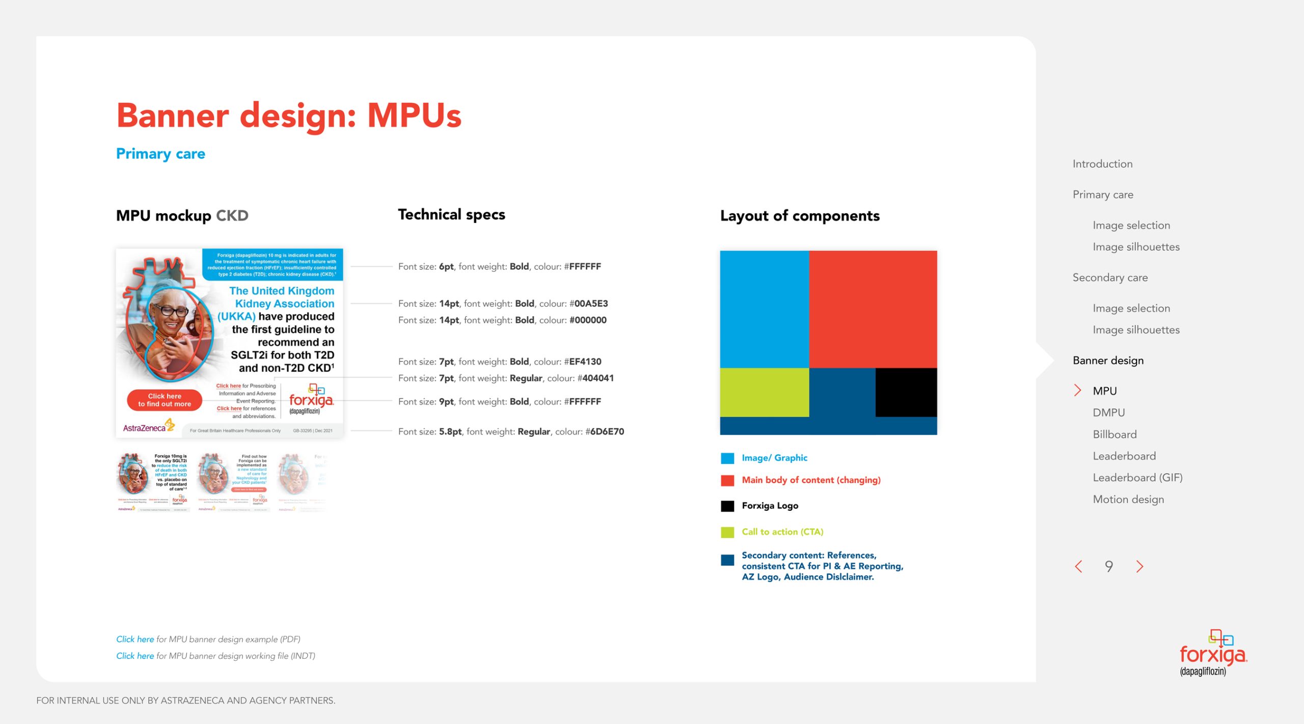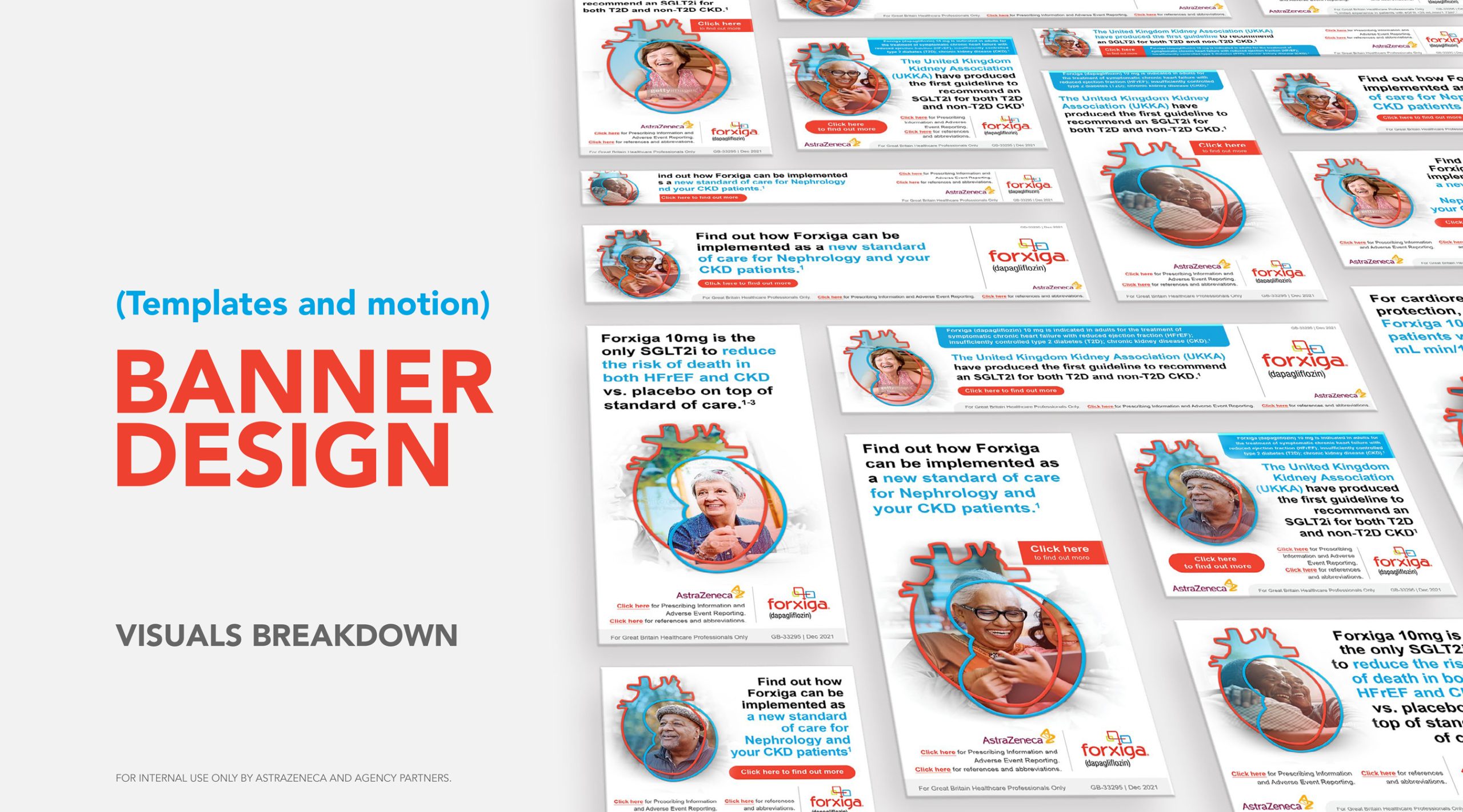 The UK Forxiga brand team needed a UK specific brand guide, with suggested layout, designs and templates that catered to the UK market whilst also serving a effective advertising templates. Creating templates that struck a balance with legibility requirements from intermediary pharmaceutical bodies as well as the fundamental purpose; i.e. to advertise to HCPs.