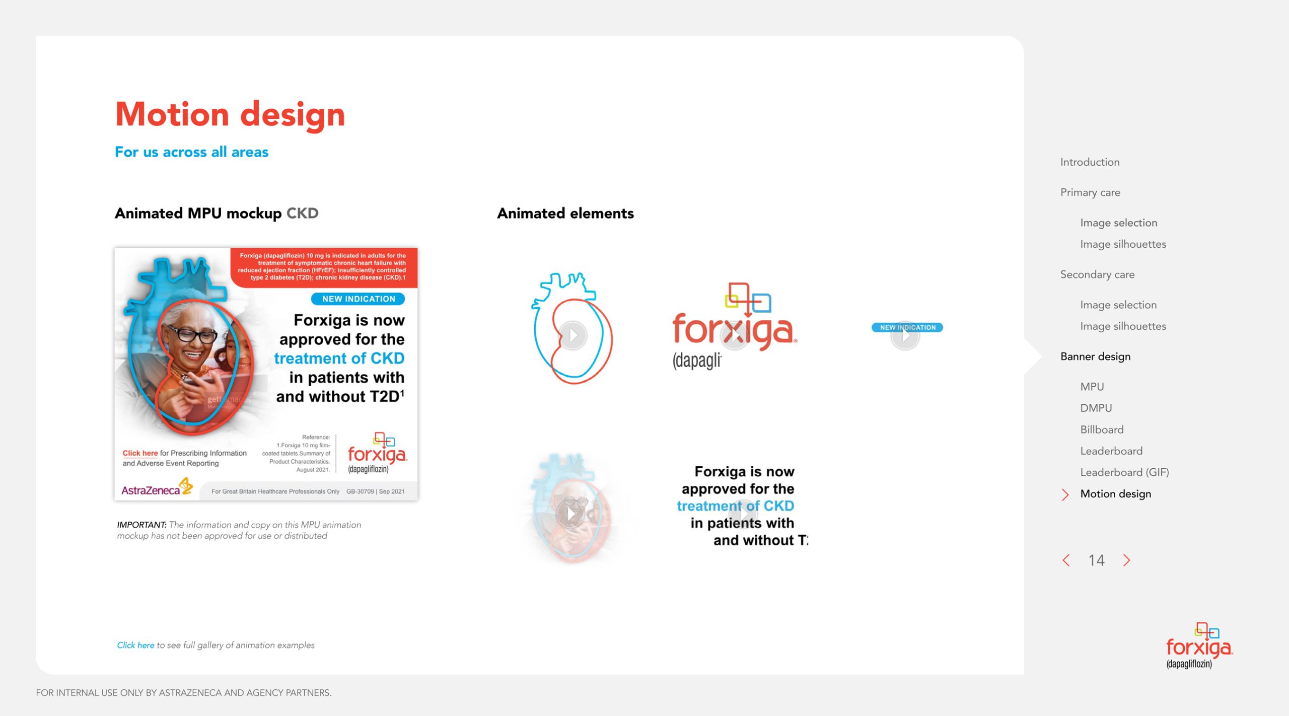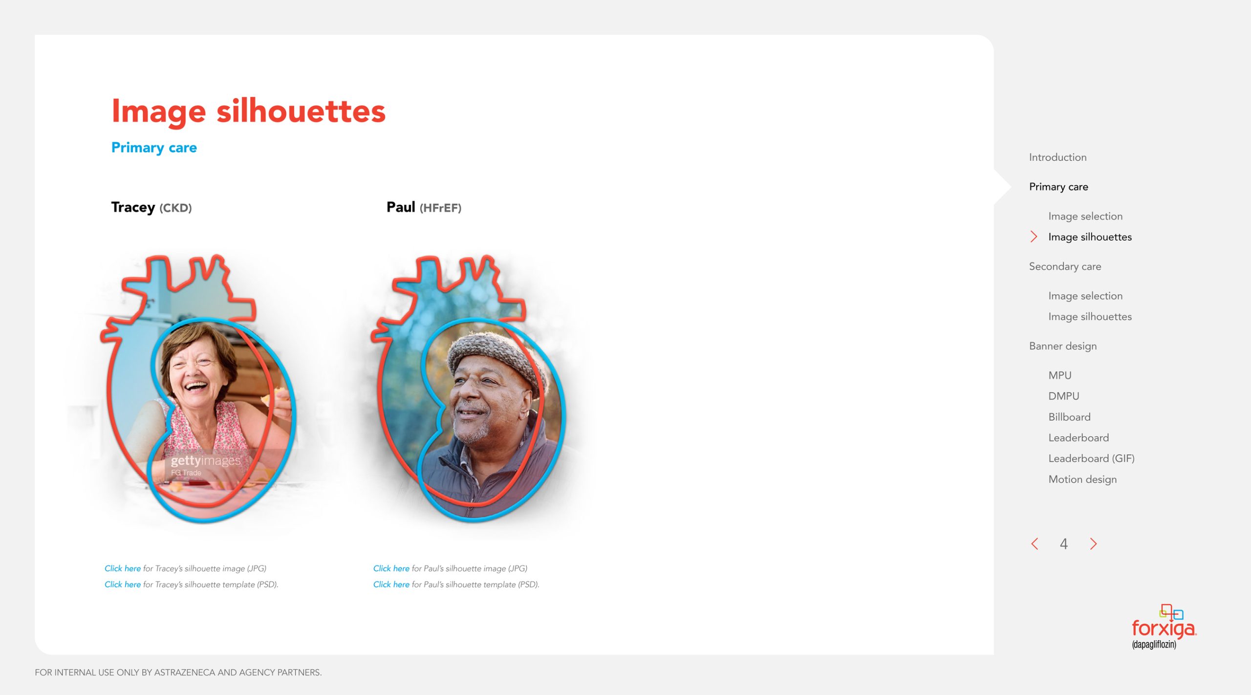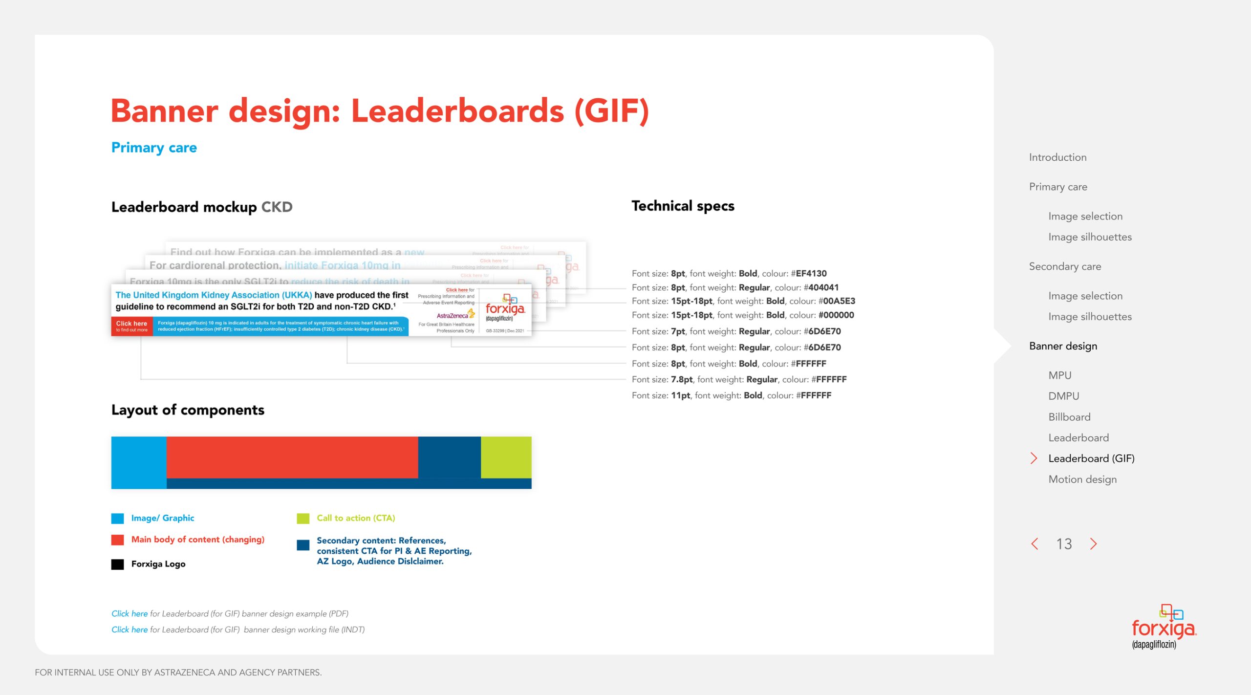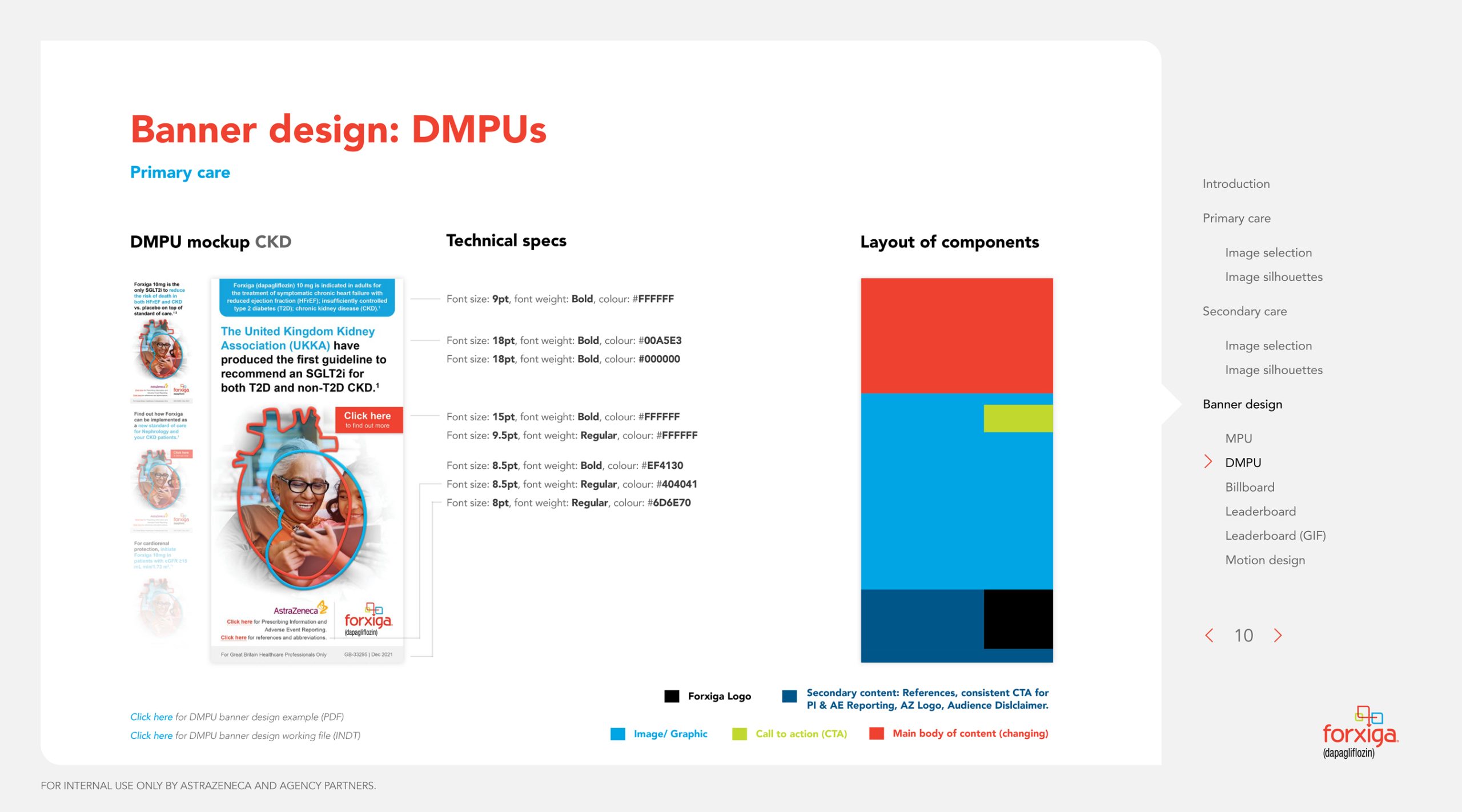The UK Forxiga brand team needed a UK specific brand guide, with suggested layout, designs and templates that catered to the UK market whilst also serving a effective advertising templates. Creating templates that struck a balance with legibility requirements from intermediary pharmaceutical bodies as well as the fundamental purpose; i.e. to advertise to HCPs.